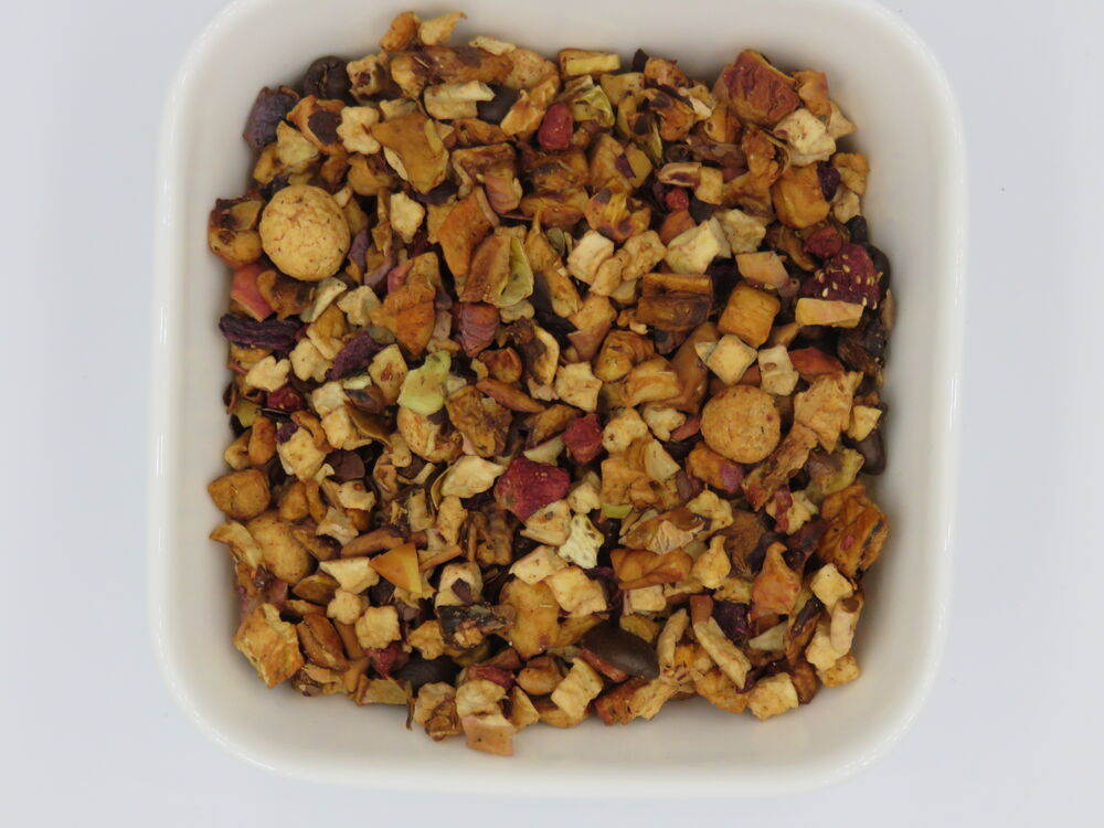 Apfel, Hibiskus, Hagebutte, Papaya*, Melone*, Mango*, Orangenschalen, Zimt, Fenchel, Sternanis, Sonnenblumenblüten, Kaktusblüten, Aroma. *Enthält Rohrzucker, Citronensäure und Calciumchlorid (Bindemittel). Kann Spuren von Kokosnüssen enthalten.