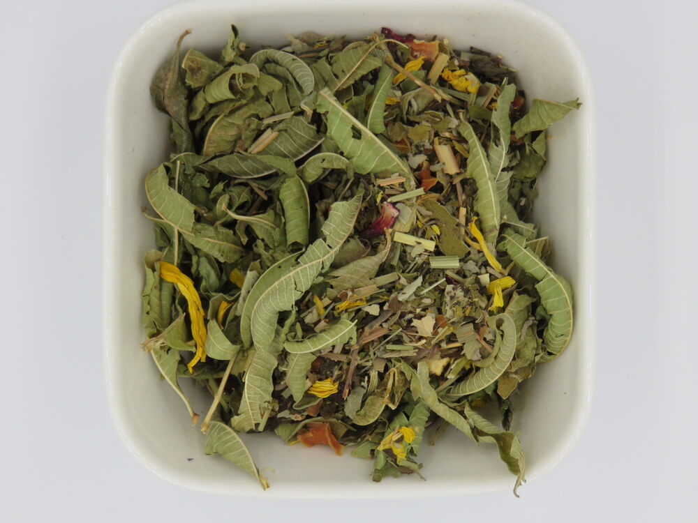 Zitronengras, Eisenkraut, süße Apfelstücke, Karotte, Orangenschalen*, Hibiskus, Brombeerblätter, Melissenblätter, Sonnenblumenblüten, Aroma. *Enthält Rohrzucker, Zitronensäure und Calciumchlorid (Bindemittel)