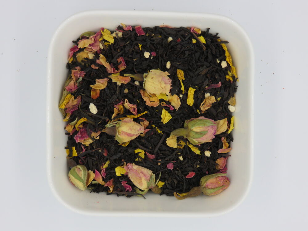 Schwarzer Tee, Rosenknospen, Rosenblütenblätter, Puffreis*, Sonnenblumenblüten, Aroma. *Enthält Rohrzucker, Citronensäure und Calciumchlorid (Bindemittel)