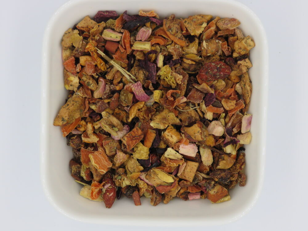 Apfel, Karotte, Kürbis, Rote Bete, Aprikosen, Hibiskus, Bambusblätter, Gojibeeren, Rhabarber, Aroma