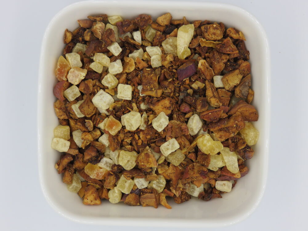 Apfel, Rooibos, Ananas*, Papaya*, Zitronenschalen, Aroma. *Enthält Rohrzucker, Citronensäure und Calciumchlorid(Bindemittel). Kann Spuren von Kokosnüssen enthalten.