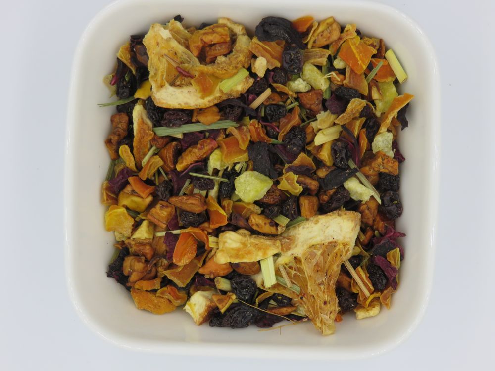 Apfel, Karotte, Hibiskus, Rote Bete, Ananas*, Weinbeeren, Lemongras, Orangenschalen, Aroma. *Enthält Rohrzucker, Citronensäure und Calciumchlorid (Bindemittel). Kann Spuren von Kokosnüssen enthalten.