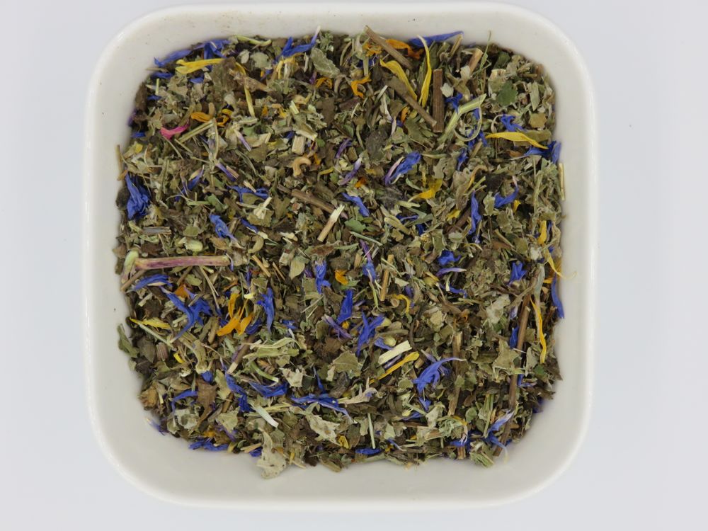 Melissenblätter, Pfefferminze, Himbeerblätter, Erdbeerblätter, Ringelblumenblüten, Spitzwegerichblätter, Schafgarbenblüten, Kornblumenblüten